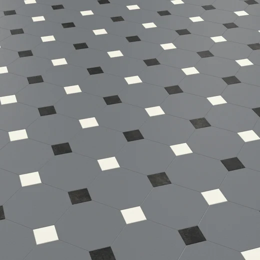 Montpellier (6″ x 6″ tile with 2.12″ x 2.12″ key square) is a bold design full of personality, combining octagonal tiles and square insets in an intricate blend of Dove Grey, Lace, and Nero. This classic layout with a modern edge adds elegance and character to any space.